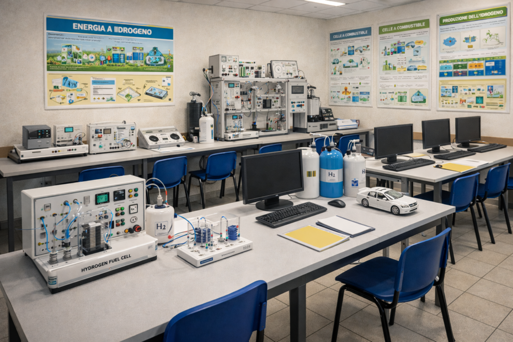Il Laboratorio Energia a Idrogeno è un ambiente didattico avanzato progettato per offrire agli studenti un’esperienza completa nello studio teorico e pratico dell’idrogeno come fonte di energia sostenibile.